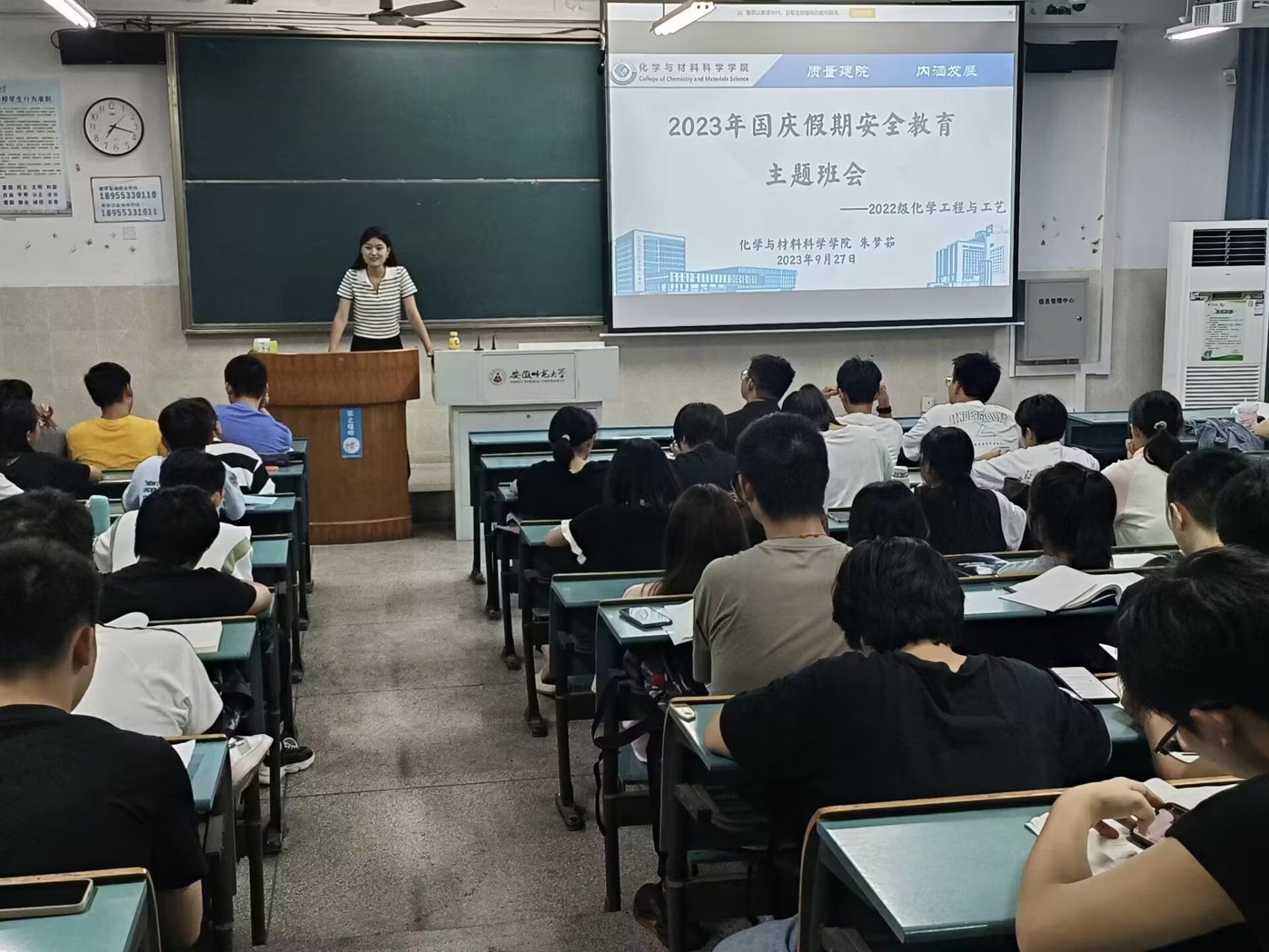 朱梦茹)为做好中秋、国庆假期学生离校的安全教育,增强学生的安全防范意识,欢度中秋国庆佳节,9月27日晚上在2010505教室开展2022级化学与工程专业召开了国庆假期安全教育主题班会,2022级化学工程与工艺专业全体学生参加。