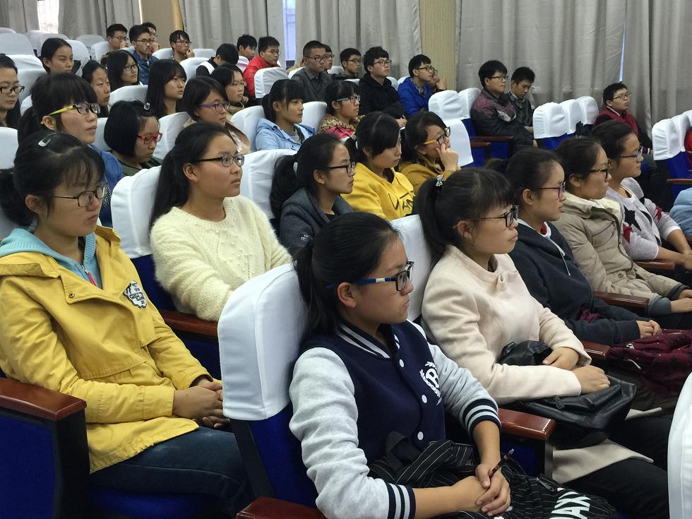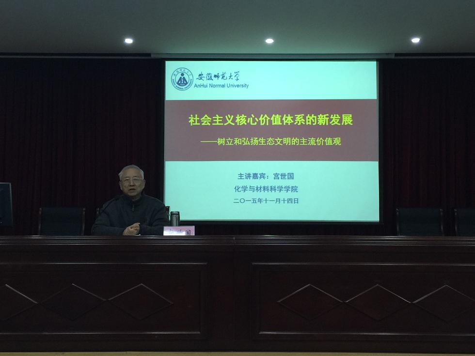,在图书馆报告厅与2015级应用化学专业110名新生做了《社会主义核心价值体系的新发展——树立和弘扬生态文明主流价值观》的专题报告。15级辅导员蒋建伟老师主持了此次报告会。