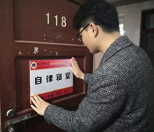 审核,拟定了14个试点“自律寝室”。试点寝室签订《自律寝室承诺书》后,无需接受例行查寝,以师生不定时抽查为考核依据,合格者优先纳入各项寝室表彰范围。11月16日下午,化材学工组分组对试点“自律寝室”进行了挂牌,各辅导员也对挂牌寝室的同学表示了鼓励、提出了要求,简单的挂牌仪式不仅是为自律寝室“亮身份”,督促其接受广大师生监督,也是为寝室同学“树意识”,以仪式感强化责任感。